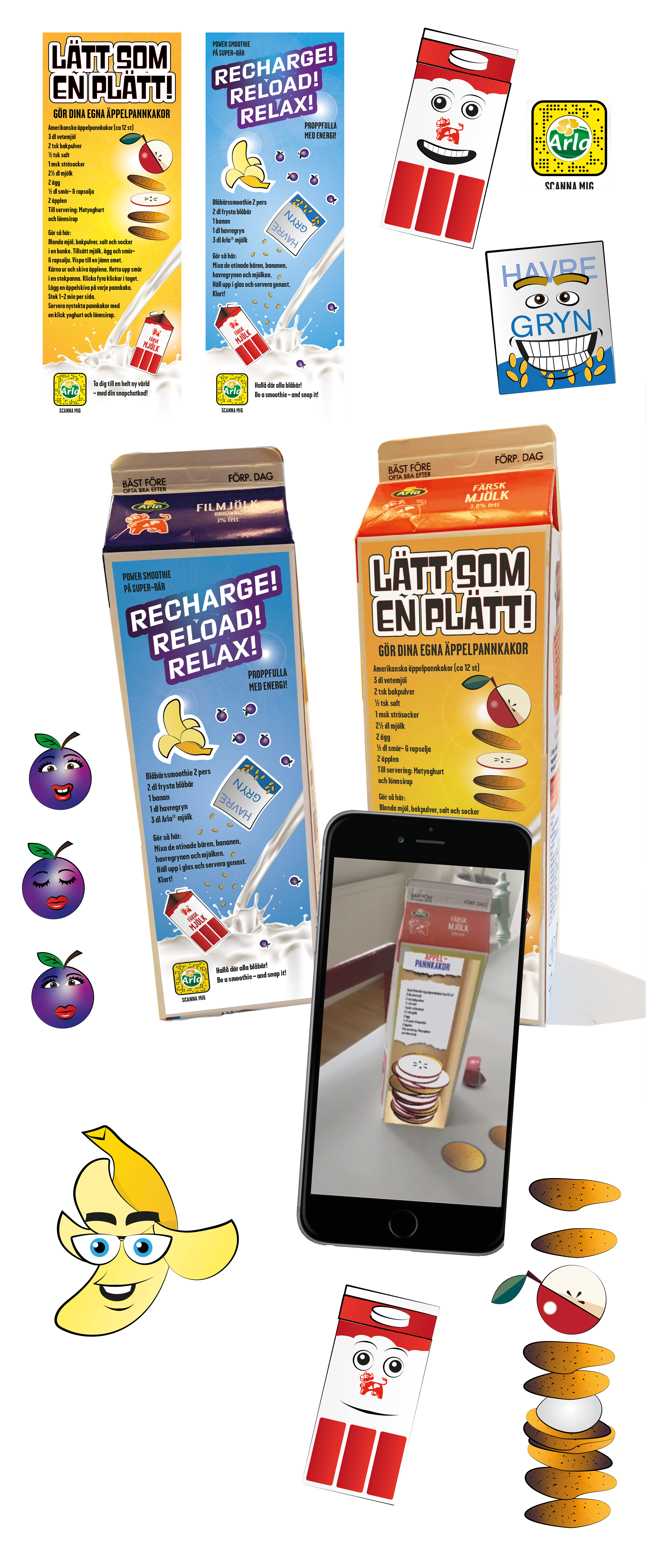 Packaging design for dairy company Arla with a snapchat filter that encourage interaction. AR lenses made by 3D interactive Stockholm.